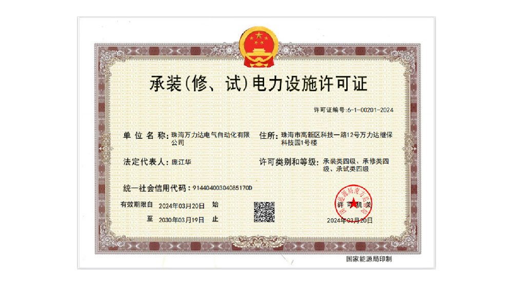 承裝(修、試)電力設施許可證是國家能源局對企業(yè)可從事電力行業(yè)活動(dòng)的資質(zhì)證明,承裝(修、試)電力設施許可證四級的取得,意味著(zhù)萬(wàn)力達電氣能夠承接35kV及以下電壓等級電力設施的安裝、維修和試驗活動(dòng),拓寬了電力服務(wù)全流程,為全面開(kāi)拓電氣智能化業(yè)務(wù)夯實(shí)基礎。