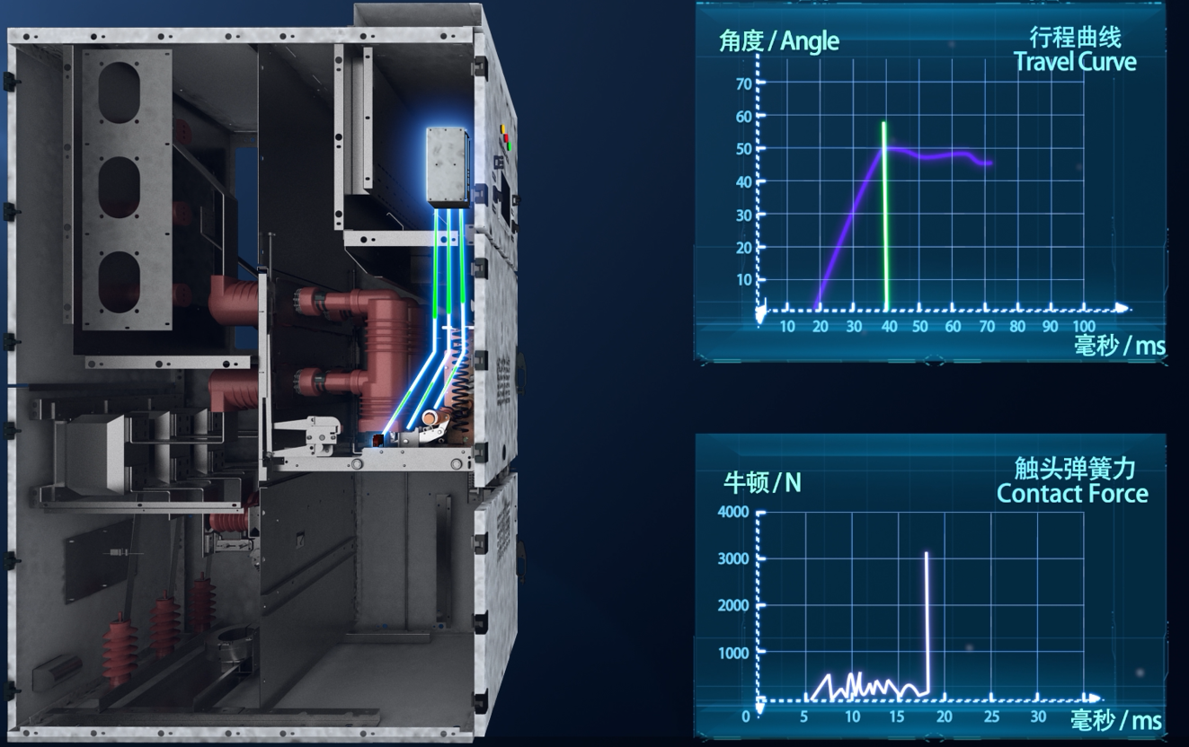 三相不同期監測的方法主要是在斷路器三相安裝機械特性傳感器+接近開(kāi)關(guān),采集分合閘過(guò)程的數據,并由智能監測裝置計算斷路器每次執行分合閘動(dòng)作時(shí)斷路器三相的合分閘開(kāi)距、超程、過(guò)沖、反彈、剛合/剛分速度、平均分合閘速度等。電氣智能化系統通過(guò)三相機械特性的指標及曲線(xiàn)相對比,綜合計算斷路器每次操作過(guò)程中的狀態(tài),深度分析斷路器的健康狀態(tài),從而實(shí)現斷路器三相不同期監測,并在出現劣化趨勢時(shí)及時(shí)告警。